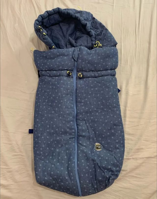 Saco de invierno universal para silla de paseo de bebe Color azul denim con estrellas Cómodo y calentito En buen estado y en su funda plástica para guardar